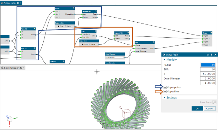 An interesting tip we would consider implementing into your workflow is the use of Separate List nodes. Let’s look at this in the context of the Spiro tube geometry, as seen in the image to the right. For this setup, two point-lists have been used, resulting in a list of lines being created. The final geometry represents the set of tubes that sit along those straight lines. With the use of Separate List nodes and utilization of True/False, the end user is now able to see the points and lines. It’s a key element to consider, particularly when working on datasets with complex shapes and structures – an architectural piece perhaps?