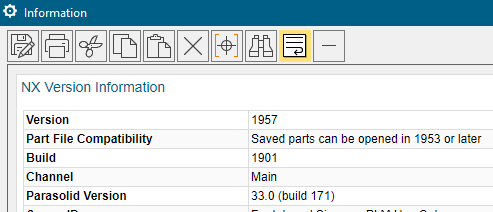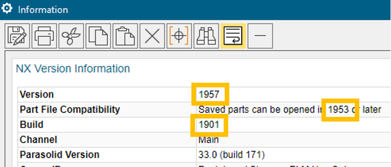 The 4 yellow highlighted value will be modified depending on the NX or Simcenter 3D release you are installing. If you are not sure of those values, launch a session for the version you will be installing and use the “Help -> About NX” command and you will see the answers in the Information window: