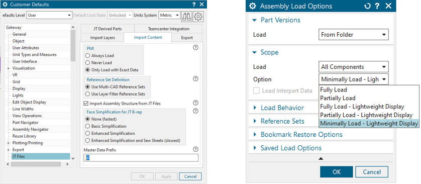 The JT Load process is now standardized. PMI is now extracted from JT when PMI user default is set to “always load” for partial and minimally load – lightweight. Only faceted data will be loaded initially to provide better performance. There will be no change in behavior when loaded as a component. Also know that the default setting for the PMI user default is set to “only load with exact data”