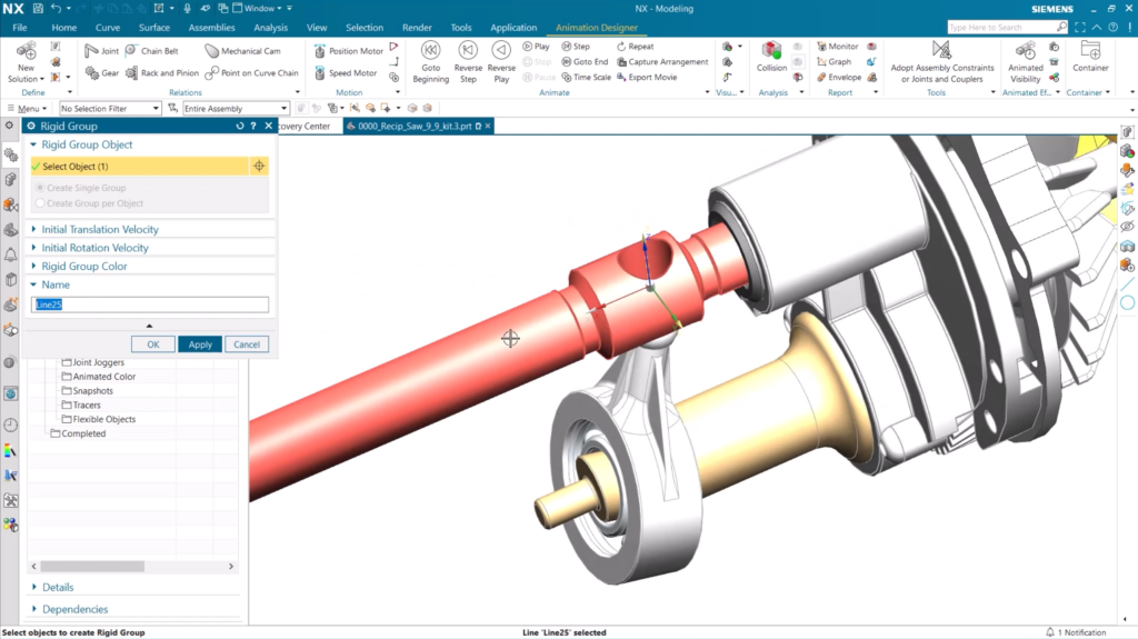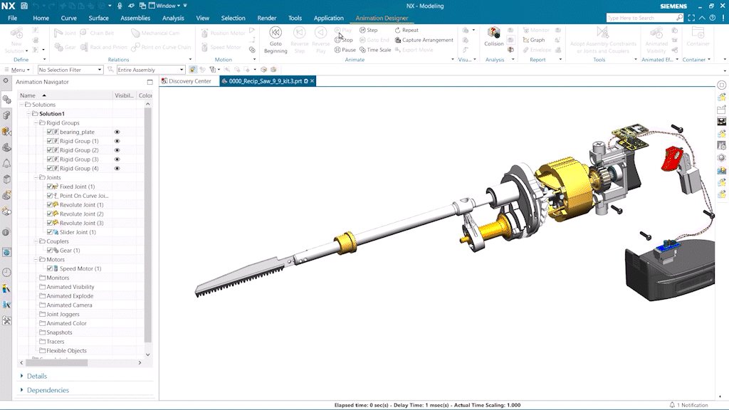 Our focus throughout the course of the blog will be on this electric Saw. We’re going to use tools within NX to create motion for the Saw. To start, simply open the Animation Designer tab; it really is as simple as that.