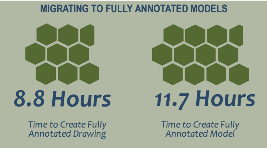 When developing a MBD strategy it’s important to understand that not everything that is typically included on a fully annotated drawing should be included when annotating a model. Some drawing-based conventions simply do not apply in the context of a 3D environment. Attempting to replicate all drawing content will increase the effort and ultimately impact your success. Studies show that the time to create a fully annotated 3D model is even higher than creating a fully annotated drawing. Through the Reduced Annotation effort dimensions are only used for quality standards and no longer to locate geometry. [2]