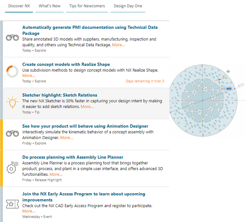 Framework that reduces the overall learning curve and promotes industry best practices based on usage pattern and actions. We’ve enhanced the Discover NX page with Fast Start videos, Release Highlights, Tips and Suggestions. Providing an enhanced visual learning experience for both new and experienced users. NX will automatically serve suggestions and best practices based on NX usage and user profile. Discovery center now supports immediate trial license activation for the Technical Data Package, Realize Shape, and Animation Designer.