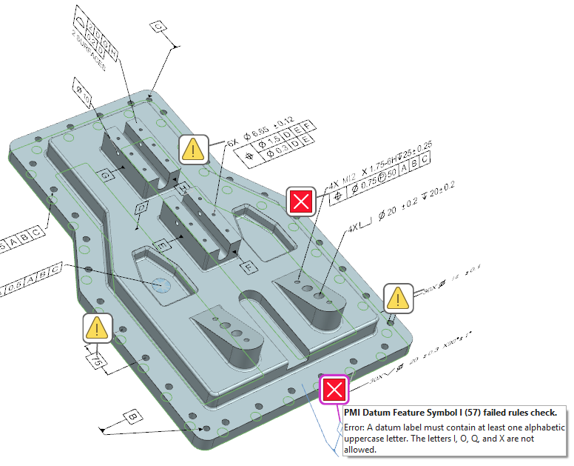 with PMI Advisor. This is a fully integrated PMI validation solution that provides notifications verifying whether PMI is compliant with industry and company standards. PMI Advisor is a configurable rule-based approach to quality checking. This supports multi-CAD validation requirements and the alerts that are provided are shown in the navigator.