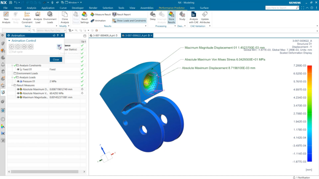 With the Results settings configured, it’s also useful to use the Animation tool within Performance Predictor. This feature makes it easier to illustrate how a part displaces with stress over the course of a test run. When using the tool, users can export visuals as GIF files, which can then be embedded into presentation.