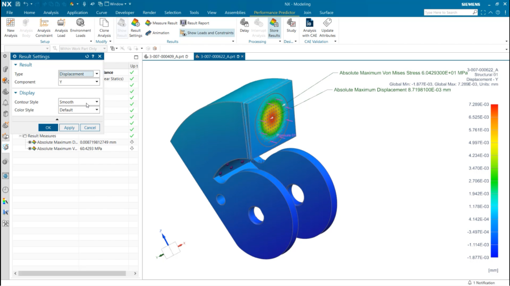 There’s a really easy way to edit, alter and change the displayed results on your screen, and that’s by looking at the Results Settings window. Within the window, users can decide if the part shows the displacement or the stress analysis. Once this is decided, there’s even more customization available! The display window can be further customized with more specific filters for each analysis type.