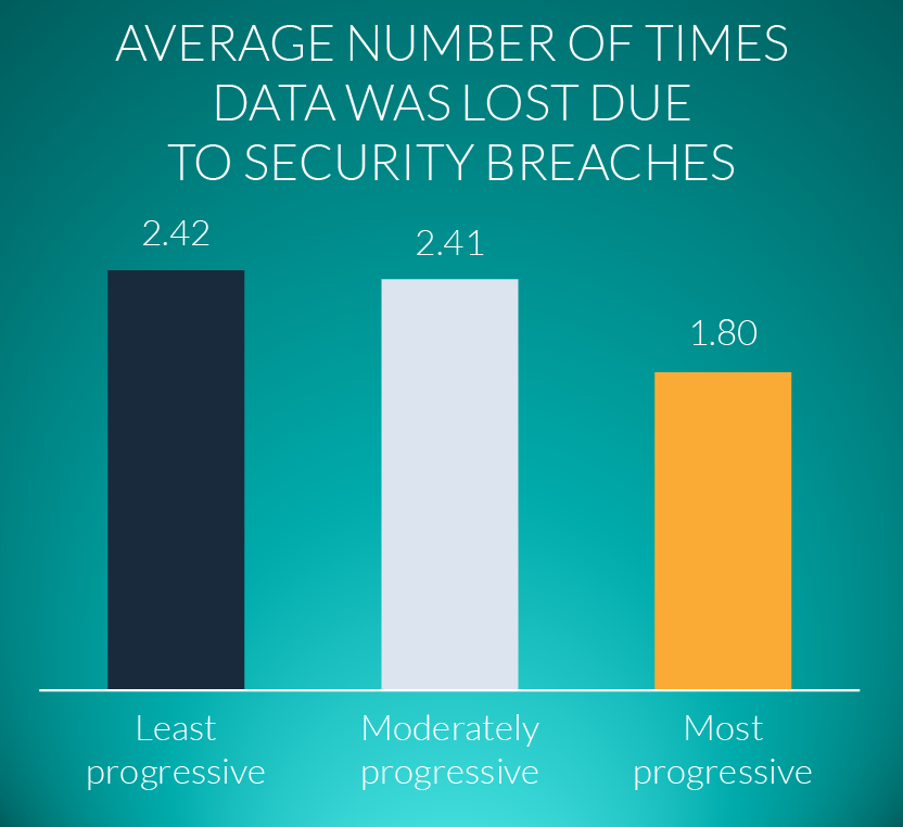 Serious gains are attained however for those companies adapting an aggressive security strategy. Companies with an aggressive strategy only lose data to security breaches, on average, 1.8 times a year – a substantial decrease of 26%.