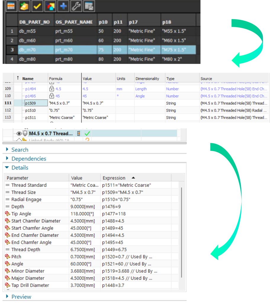Let’s shift focus to Part Families. Thread Expressions are now exposed and can be used in Part Family Tables. We’ve added support for Thread feature parameters in Part Families. This includes Thread Standard, Thread Size, and Radial Engage Expression. Additionally, you can renew old Thread features to get updated functionality.