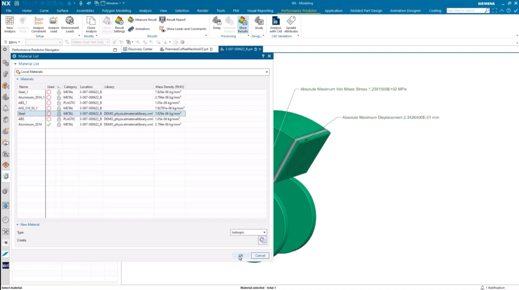 We’ll be using Performance Predictor to evaluate the tamping system within the coffee machine. The swinging mechanism pushes water through ground coffee at pressure to create espresso. Once done, it then ejects the used coffee for disposal. we’re going to simulate how the water pressure affects the mechanical performance of the system and test different materials.