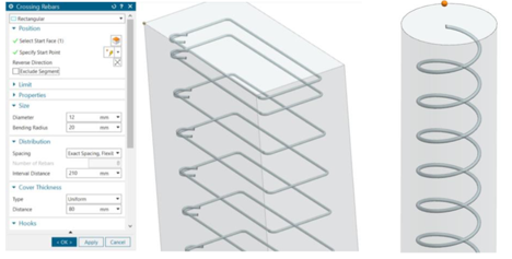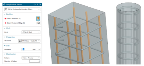 Reinforced concrete design is now included within our integrated suite of NX tools. With NX for Concrete Design, you can easily create Crossing Rebars associatively with the concrete form. We’ve added support for rectangular and cylindrical precast elements, whilst Crossing Rebars are generated based on the shape of the concrete. Additionally, Longitudinal Rebar is positioned along the inside of the Crossing Rebars, but the On Points type offers the flexibility to place rebar at any point.