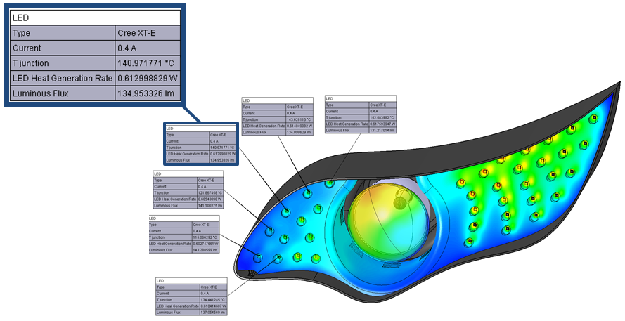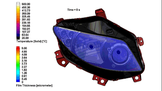 Simcenter FLOEFD has seen marked success when applied to automotive lighting applications, especially LED based solutions. LEDs run cold, compared to other lighting solutions, and so with a much cooler housing the risk of lens condensation, fogging and subsequent lighting safety concerns is much increased. The highly complex geometries coupled with Simcenter FLOEFD’s Octree meshing approach, a specialized sub grid boundary layer resolution method and an LED simulation module make Simcenter FLOEFD the perfect choice for such CFD/Thermal/Optical lighting applications, as seen in the following animation. The lamp cluster heats up, due primarily to optical radiative effects, and reduces the initial water film thickness due to evaporation over time.