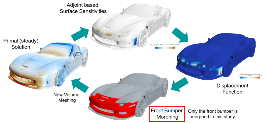 We used the Corvette C6 ZR1 geometry in this case study. The geometry is fully detailed, including the cooling package and engine compartment. We are leveraging the power of Simcenter STAR-CCM+ for external car aerodynamics: the tire rotation is modeled with moving reference frame and tangential velocity. We have used our best practices for running the flow and adjoint solution, which include the coupled solver with Automatic CFL and SST k-ω with all y+ wall treatment. For this case, we are only morphing the front bumper as shown below and following the depicted process. We have also set the maximum displacement value for each iteration to be 5mm.