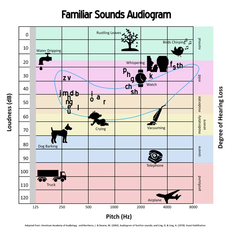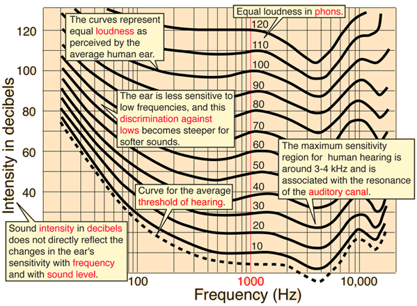 The lines on this graph each correspond to the Sound Pressure Level (SPL) required at various frequencies to be perceived as equally loud to a pure 1000Hz tone.