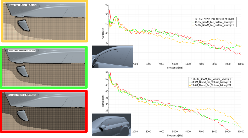 Thanks to the improved hybrid model recently developed (the Perturbed Convective Wave Model) and GPU availability, it’s never been easier to evaluate multiple designs in a shorter amount of time. Right now, the aeroacoustics simulation at hand takes about 71 hours on 400 CPU for a 54 million cells model to run, but only 33 hours on 4 GPU cards (equivalence calculated as 1 A100 = 216 CPUs).