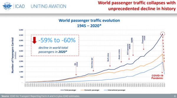 Empty planes. Border restrictions. Mandatory quarantines. Slashed demand for aircraft. The global coronavirus pandemic of 2020 has ravaged the Aerospace industry unlike any other global event in history. Just one look at the ICAO chart on world passenger traffic evolution shows the unprecedented decline in demand – A 60% decline in total passenger traffic.