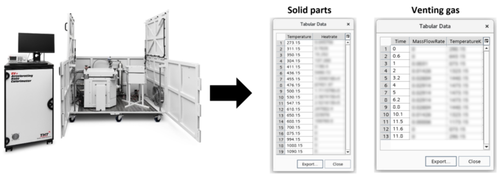 The input values for the battery simulation come from an experiment performed with a single battery cell in a so-called accelerated rate calorimetry (“ARC”) test. They consist of two tables: