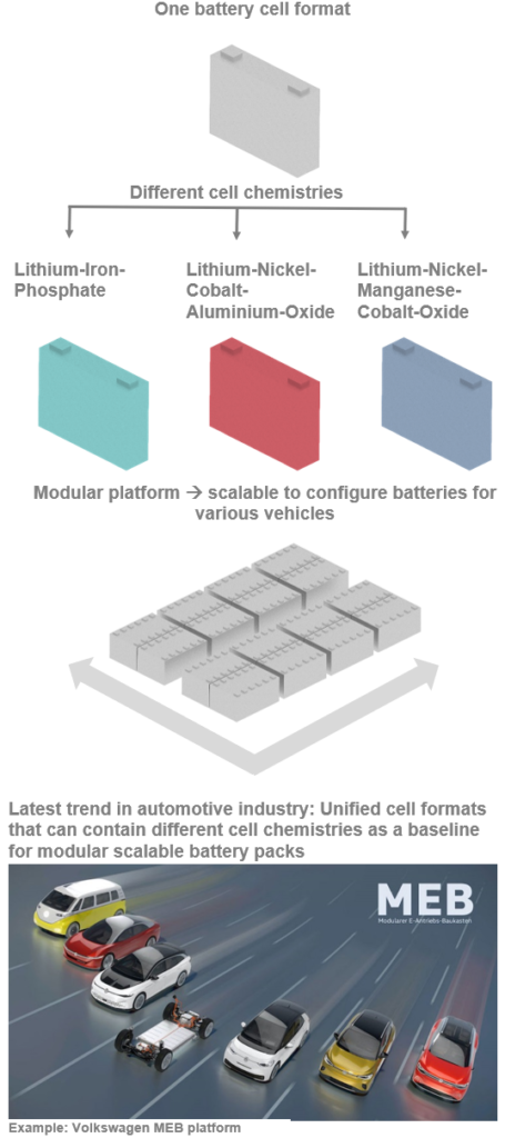 In order to save costs and use synergies wherever possible, there´s a trend in the automotive industry to use unified battery cell formats, that can contain different cell chemistries. The cells are integrated in a modular platform that can be scaled to achieve different battery pack configurations.