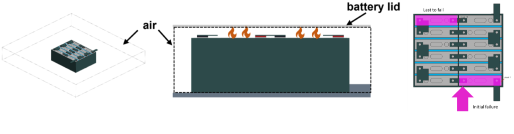 In order to be time efficient, the thermal runaway behavior is analyzed on a single module with surrounding air. The gap between the top of the cells and the lid of the battery casing is modeled accurately to take the reflection of the hot venting gas into account.