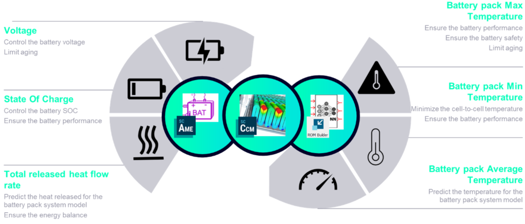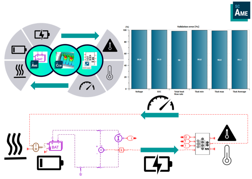 For further development of the electric vehicle, it is of interest to predict how the battery interacts with other parts like the environmental control system. Simcenter offers a new type of reduced order model, that combines the high accuracy of 3D battery simulations with the speed of a system simulation. It’s a hybrid between a neural network model for temperature prediction and a system equivalent circuit model: