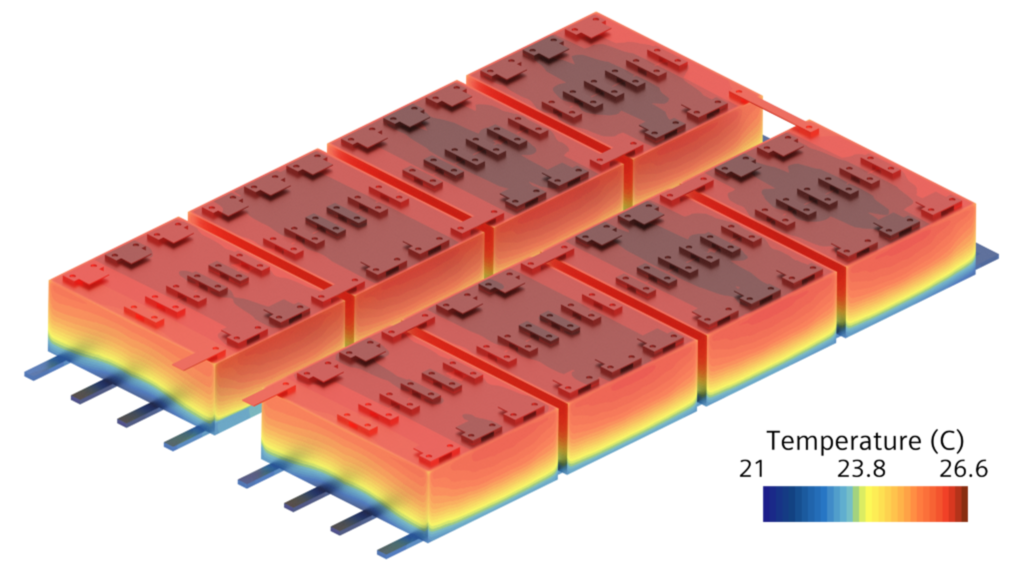 The 3D CFD battery simulation including the cooling system enables the user to identify hot and cold spots early in the design process. This information can later be used to place temperature sensors for experimental tests or to get information about the maximum temperature gradients over the cells, what is important for aging analysis. For the analysis of the liquid cooling system, it is not necessary to simulate the air inside the battery module as it was done for the thermal runaway simulation. It is enough to simulate the cooling fluid and define the heat transfer coefficients between the solid parts and the air inside the battery in form of a convective boundary condition.