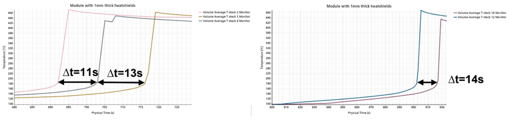 For a battery module with 1 mm heatshield thickness, 2 Critical areas can be identified where the time in between single cell propagations is too short.With a 3 mm heatshield thickness, 3 Critical areas exist with short propagation time deltas between cell pairs. Finally a module with 6 mm heatshield thickness is the safest design! A lot helps a lot! For the set up with 6 mm thick heatshields, there is only one critical area left for which the time difference between two cells is 7 seconds. The rest of the cells propagate with sufficient time in between, leading to the overall longest thermal runaway time, so that the design can be considered as safe!