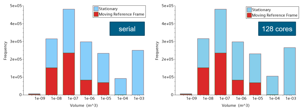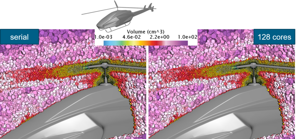 See an example of mesh similarity for aerodynamics simulation of a helicopter below. Note the very similar cell volume distribution in serial versus 128 cores, indicated by the pictures as well as the histograms.