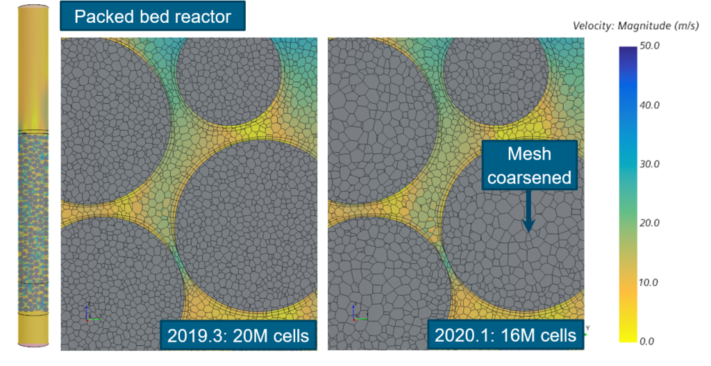 The improved growth rate will often result in a lower cell count than in previous versions, and consequently shorter solver CPU time. See an example of a packed bed reactor below, where the new mesher allows reducing the total cell count from 20 to 16M cells, since it provides a better growth inside the particles, where heat transfer is calculated. This makes the simulation 1.1x faster.