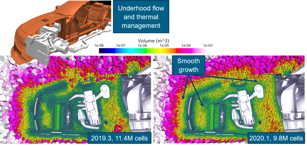 Finally, if you are an existing Simcenter STAR-CCM+ user, you will among other things benefit from a smoother, easier to control and more predictable volume growth rate than before in the new mesher. See an example below, where a very smooth growth rate is observed for an underhood flow simulation.