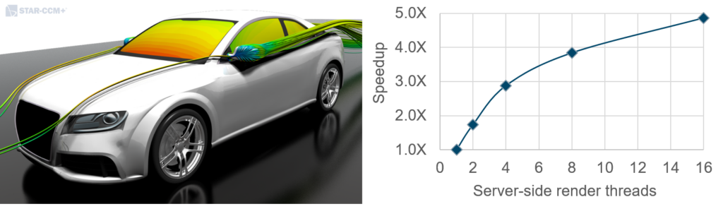 On top of that, for CPU based rendering, you can create images many times faster through multi-threading. See the picture and chart below for an example, where the velocity magnitude around the rearward mirrors is visualized through fluid streamlines and the pressure is visualized on the windows. This picture is rendered 5x faster on a 16-core node!