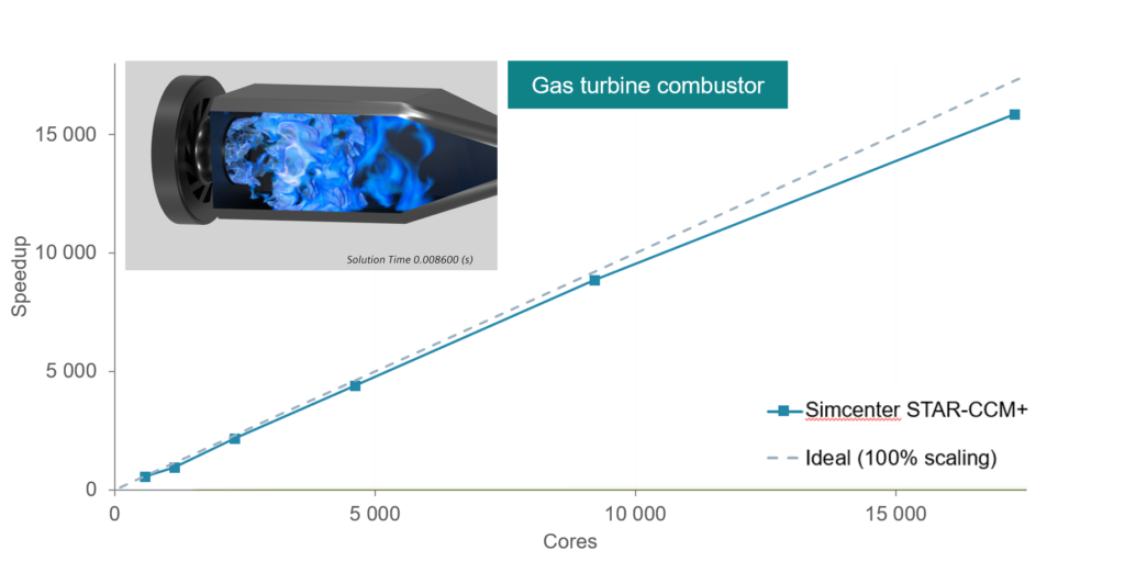 Even with complex physics enabled, such as combustion, very high scalability can be reached. In the chart below, a gas turbine combustor is shown to run 41 times faster when scaling from 450 cores to 17,300 cores! The Flamelet Generated Manifold combustion model is used in an LES setup on 692 Million cells.