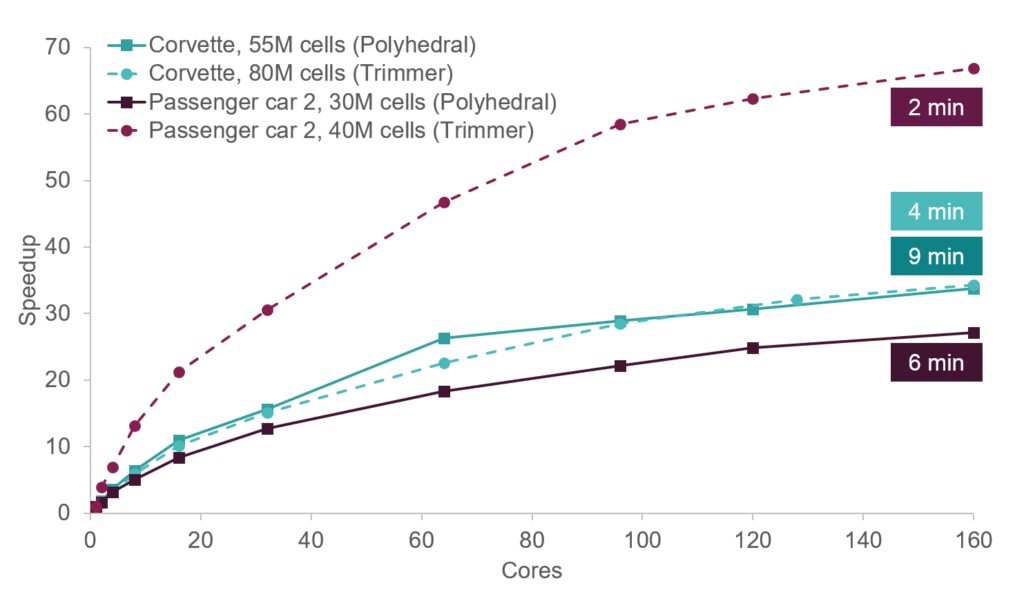 Meshing: The polyhedral and hexahedral (trimmed) meshers are fully parallelized, enabling you to create high quality meshes in a matter of minutes! The chart below shows meshing scalability for external aerodynamics simulations of two car geometries. A polyhedral + a trimmed mesh was created for each car geometry, based on the same surface mesh and settings, using suitable prism layer settings for drag prediction. As you can see, you can create a high-quality mesh for external aerodynamics in just a few minutes.