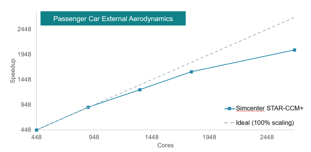 See the example below where drag calculations for a passenger car is shown to scale well, offering a speedup of 4.5x when increasing the core count by 6x from 448 to 2,688. This is a 100 Million cells DES simulation including the underhood and modeling tyre rotation using moving reference frame.