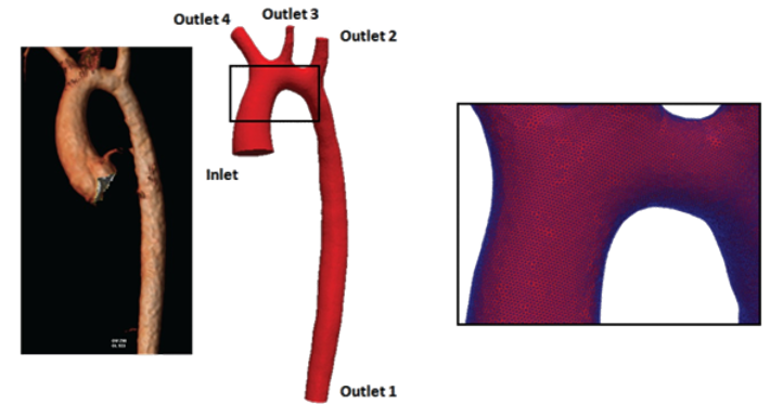 For reference, we took an aorta geometry from http://www.vascularmodel.org/miccai2013/. We then generated a sufficiently big box around it as the starting domain, constrained the inlets and outlets in accordance to where they are for the real aorta, then added some (admittedly simplified boundary conditions – blood can be a nightmare in cfd)  and let the magic happen.
