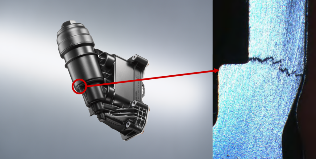 Figure 3: Industrial Use Case: Oil-filter system from MANN+HUMMEL, subject to thermal and pressure load (left); damage in test (right)