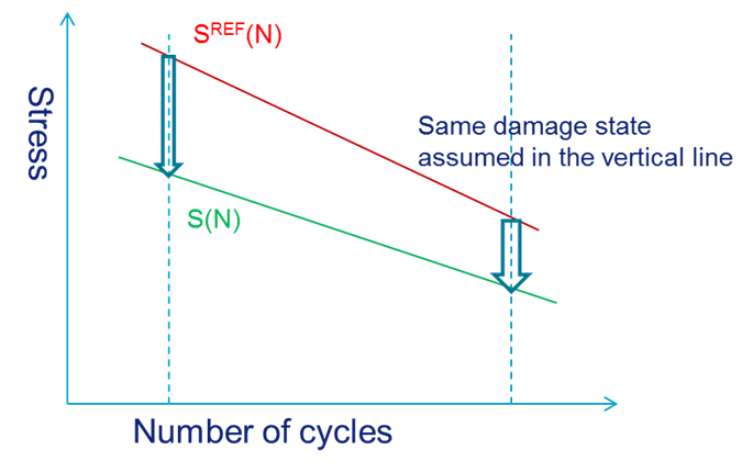 In the Master SN Curve approach, you start with an SN curve for a given orientation. From this SN curve, you then read the stress amplitude for a reference life (for high cycle fatigue it is about 10,000, 100,000, or a million cycles). Then, the damage from this stress level is calculated on a microscopic level. Then for the target fiber orientation, iterate the applied stress amplitude until you have exactly the same damage. Consequently, we know the damage that corresponds to the stress on the material volume, for a given orientation.  This information is then used to shift the Master SN curve. The described procedure is repeated for multiple points to account for a change in the slope of the SN curve.