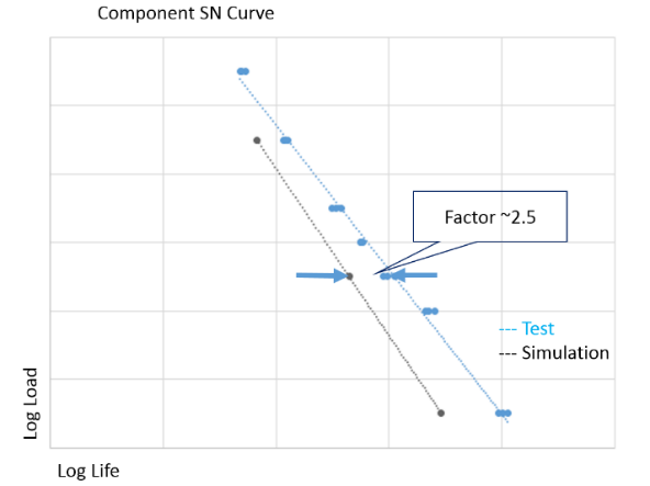 Figure 6 shows the test results versus simulation results at 3 different load levels. The simulation is slightly conservative, underestimating the actual fatigue life. The new method predicts the lifetime (and damaged area) as well as correct component behavior. It can do this even for high loads, and therefore high plasticity.