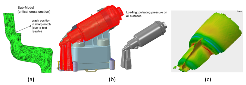 As a first step in the required CAE process chain, injection molding must be simulated. This is in order to obtain the local orientation tensor. Figure 4a shows the fiber orientation in the critical area of the component. You should map the fiber orientation from the manufacturing simulation model onto the structural simulation model. It is likely that both models use a different mesh topology. As a result, in this situation, you should apply the software Converse [1]. This provides not only the local orientation tensor but also a full set of anisotropic material properties if requested. Then you can perform finite element analysis. Since the Master SN Curve approach uses automatic stiffness reduction, the finite element calculation uses the internal finite element solver (Simcenter Samcef). A result in the critical area is shown in Figure 4c .