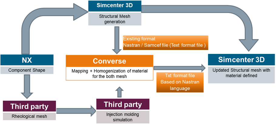 The second step is mapping this information to the structural mesh. For this purpose, we use the tool Converse [1] by PART Engineering, which has dedicated mapping techniques available. Short fiber reinforced composites show an anisotropic behavior, caused by the alignment of the fibers during injection molding. This behavior is considered in the proposed simulation process. In the structural simulation, it’s common to assume isotropic material behavior, which can cause designers to apply high safety factors on their design, and may lead to over dimensioning.