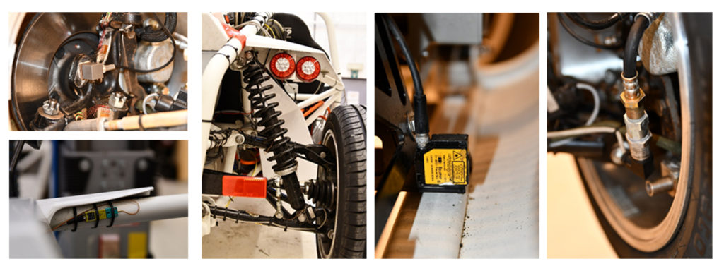 Accelerating and braking gave us information on the correlation between the front and rear sensors on the car. Here we have put a sensor (rotary potentiometer) on the brake pedal, to measure its angular position. This allowed us later on – when processing the data – to link the measured loads to the actual maneuver performed with the car.