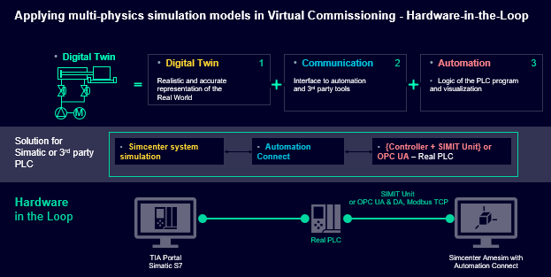 - Simcenter system simulation also supports the control development by easily coupling high-fidelity physical models with control logics, in MiL (Model-in-the-Loop), SiL (Software-in-the-Loop) and HiL (Hardware-in-the-Loop) environments. The Automation Connect interface also makes it possible to couple a system simulation model with the PLC automation either as SiL or HiL environment in case you have an emulated PLC or a real PLC connected to the virtual model