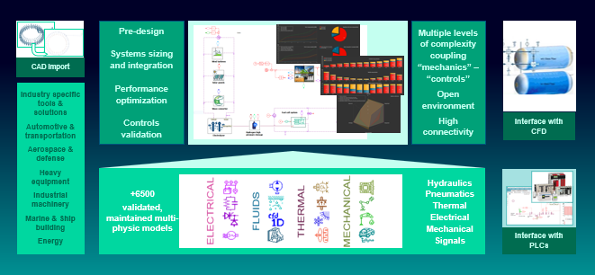 - They include multi-physic libraries in an integrated environment to represent different physical domains as mechanics, electrics, fluids, thermal, … and all these domains interact all together in the same system simulation model