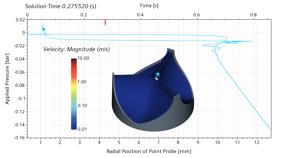 Below is a snapshot corresponding to 0.275520 seconds, roughly 32% of the cycle. The valve is still nearly closed. The blue dot in the graph indicates the current pressure and the current radial position of the point probe. The slope of the graph in the vicinity of the blue dot is high. This means that a significant change in the pressure is required for a significant change of the radial displacement. With other words, the valve has a significant stiffness around the closed configuration.