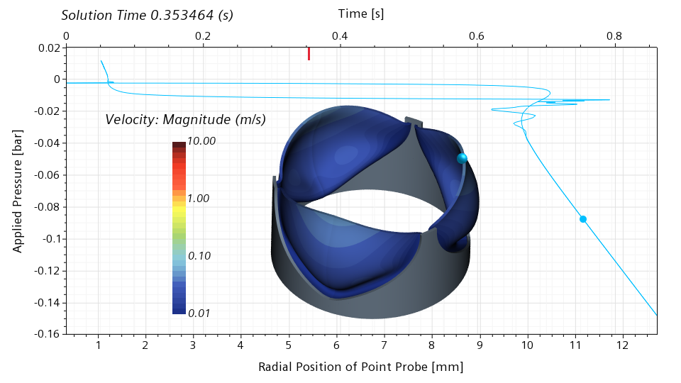 I will use my simulation results to illustrate the snap through in more detail. In the scene below, I show the velocity magnitude on the leaflet surface. In addition, I show a point probe on the leaflet edge. This point probe follows the motion of the leaflet. In the graph, I show the applied pressure on the vertical axis, and the radial position of the point probe on the bottom horizontal axis. The red bar on the top horizontal axis shows the physical simulation time.