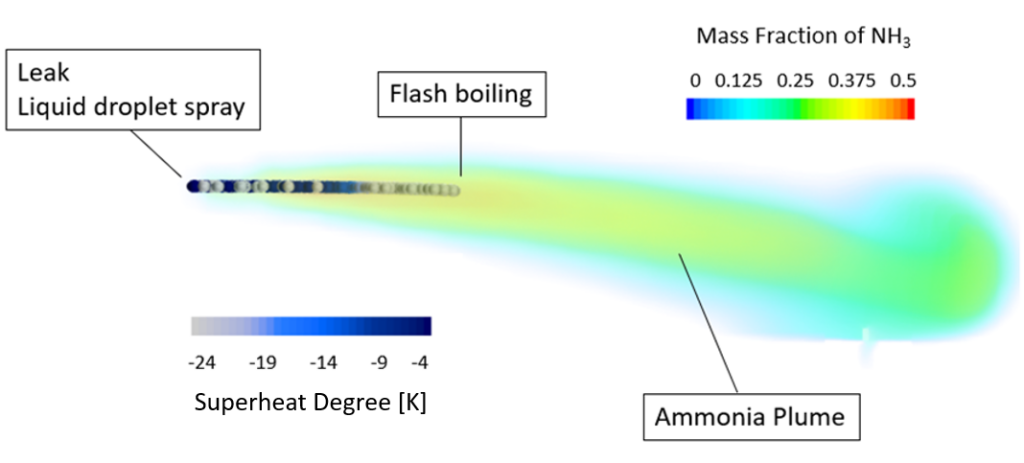 LNG and ammonia are stored in cryogenic state, which means that any exposure to environmental conditions, e.g., through leakages during bunkering, will lead to instant vaporization (flash boiling), putting the crew at risk and presenting numerous environmental hazards. Flash boiling of the liquid spray from a pipe leakage into the environment occurs because the ambient pressure is below the liquid fuel’s saturation pressure. Depending on the direction of spray and distance to adjacent structures, rainout of the dispersed vapor cloud can occur: the impingement of remaining liquid droplets from the mostly vaporized spray, then highly flammable.