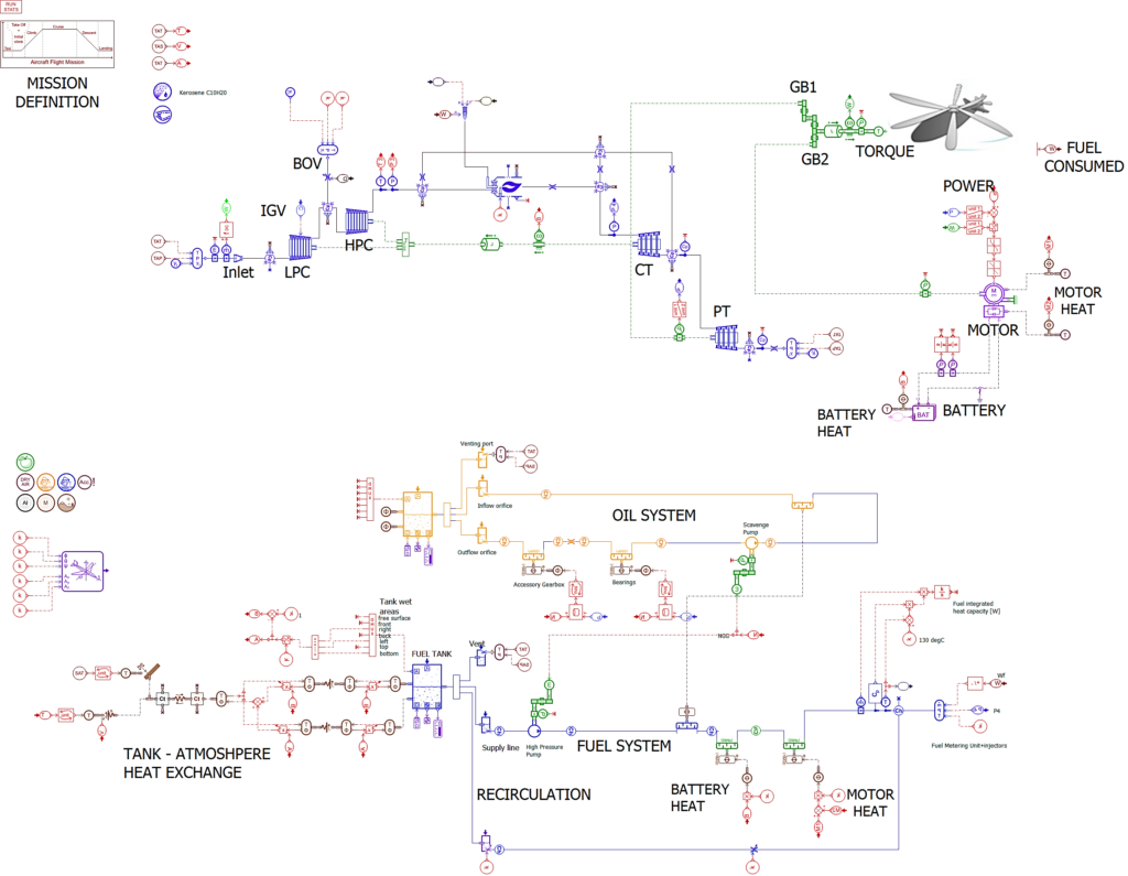 Developed with Simcenter Amesim, the simulation framework integrates the thermal and electric powerplant model, on top of a helicopter power demand model and suitable pollutant emissions calculation correlations.