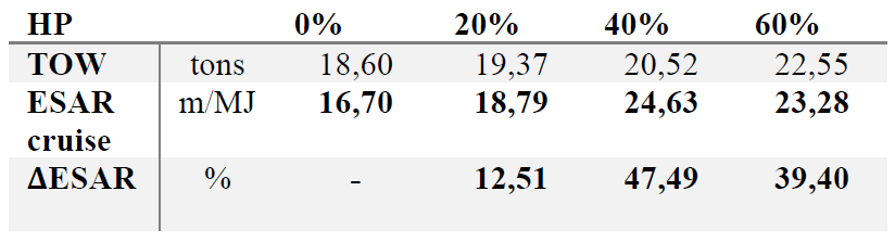 Remember that this Degree of Hybridization was left undecided in the logical architecture. The powertrain was then simulated with different values, ranging from 20 to 60%. The analysis shows that Energy Specific Air Range (ESAR), which is the distance covered per unit of energy, increases with the Degree of Hybridization up to a certain point. The best variant was found to be 40%. Above that, the added weight of the electrical components cancels out the benefits in ESAR.