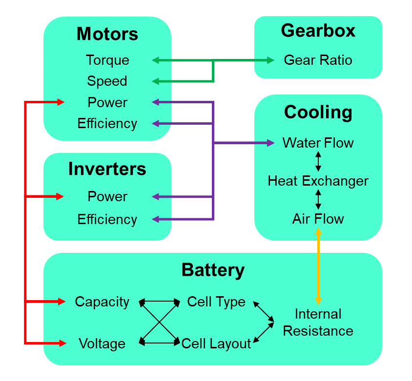 Out of these stages, the second one is often the most difficult to navigate, due to the highly complex interaction of subsystems in the car. It is difficult to predict the impact of changes being made to these subsystems. Especially for a team dealing with a fully electric system for the first time, the complexity can be daunting. Here is a diagram of the components of an electric powertrain and how the design parameters are interconnected: