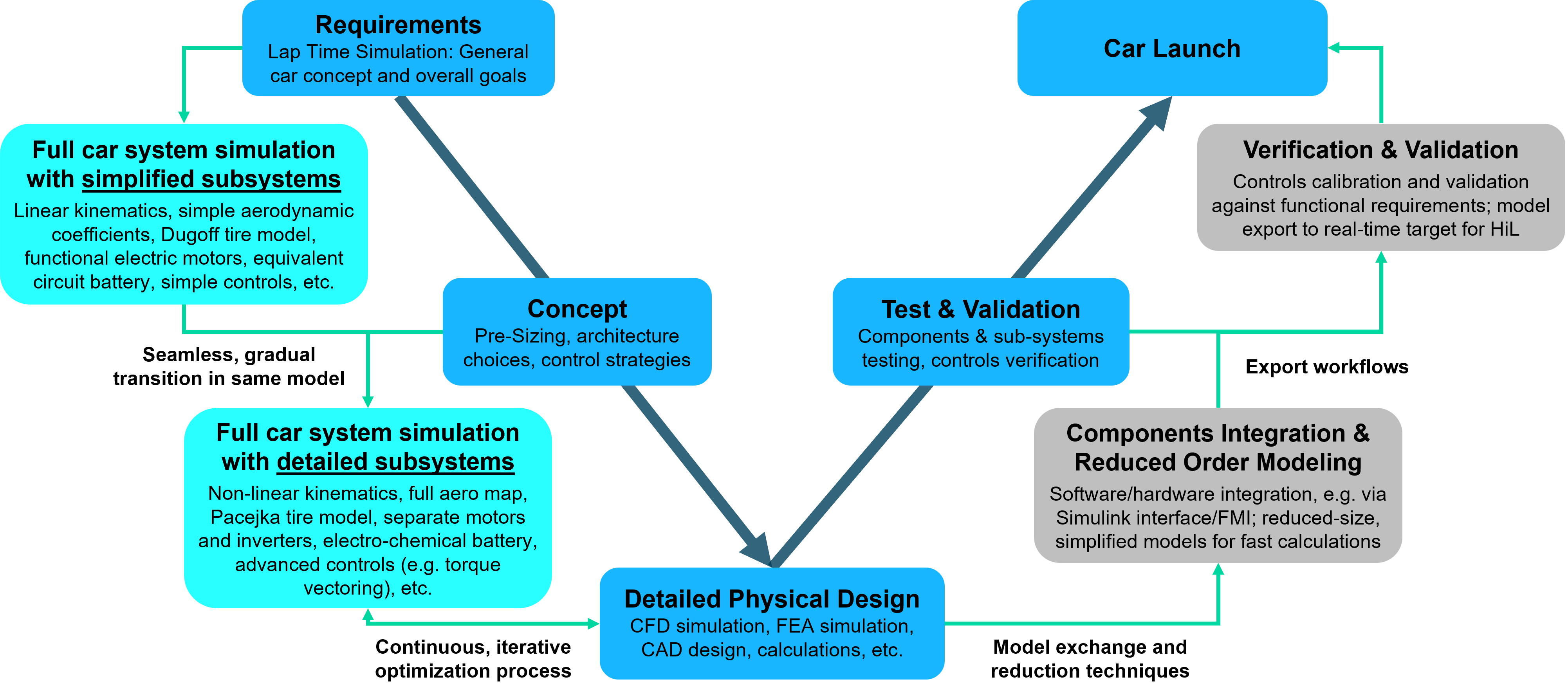 - Overall goals for the car are set, commonly by utilizing a simplified lap time simulation (LTS). The LTS uses a simplified vehicle model (e. g. point mass or bicycle model) which assumes steady-state conditions to determine relative performance sensitivities of general vehicle parameters like weight, power, grip, etc. Using these sensitivities, trade-offs can be evaluated, and a general car concept determined. This means choosing the chassis type (steel tube frame or carbon fiber monocoque), the powertrain architecture (how many motors, location of the motors), the tire type and size, etc.