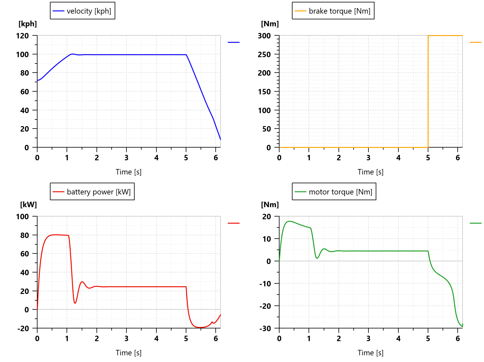 The velocity plot shows the vehicle accelerating to the starting velocity and then hitting the brakes at five seconds. Below are the front left motor and brake torque, respectively, followed by the battery power. During the maneuver, the brake pedal is fully pressed down, meaning that the mechanical brake is providing maximum braking torque. The controls limit the braking torque of the motors so that the recuperation power limit of the battery— 20 kW in this case — is not exceeded.