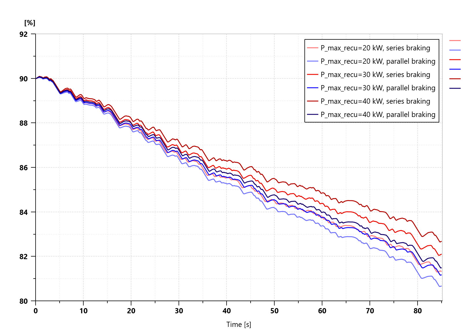 First, battery cells with different recuperation characteristics and different braking strategies are evaluated. The main goal is to determine the effect of these parameters on energy consumption. This will then allow an informed decision to be made about which cell to proceed with for the further development of the car. Since this test case is located early in the development phase, subsystem models are kept in their simple and functional form.