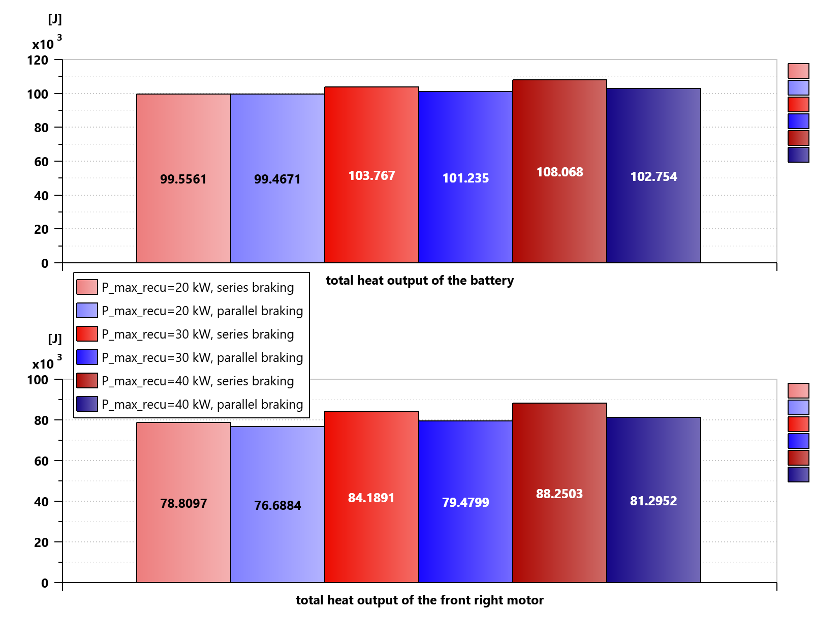 The tradeoff is that with higher recuperation power and more frequent usage of the motor brake, more heat will be generated, thus increasing the requirements for the cooling. The following plots show the total heat being generated over one lap by the battery and one of the motors.
